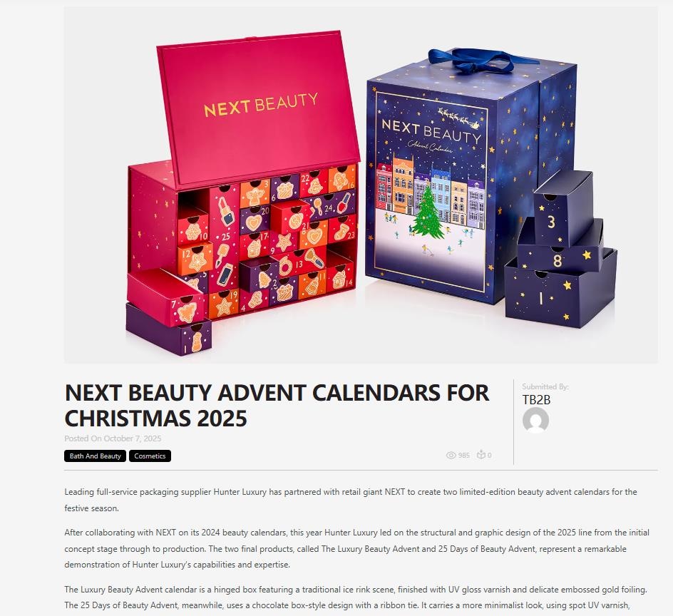 隨著圣誕節(jié)的臨近,越來越多的品牌開始推出限量版美容日歷,成為消費者年終購物清單中的亮點。今年,領先的全方位包裝供應商 Hunter Luxury 與零售巨頭 NEXT 再度攜手合作,打造了兩款限量版美容日歷,分別是《奢華美容日歷》和《25天美容日歷》。這兩個日歷不僅是節(jié)日季節(jié)的精彩呈現(xiàn),也是 Hunter Luxury 技術實力和設計創(chuàng)意的完美展示。